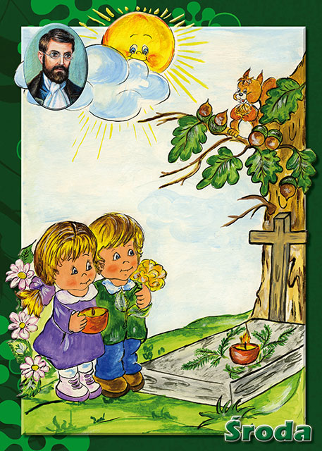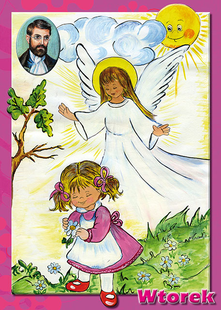 § 40. Reg. … mają także jeszcze trwać wesołe zabawy, ale już opowiadania o różnych rzeczach, które dzieci widzą, tłumaczenie obrazków, uczenie się wierszyków, i zabawianie się robótkami, ma do poważniejszych zatrudnień zaprawiać. Ponieważ zaś wtorek, przeznaczony jest nabożeństwu do Aniołów Stróżów, przeto mają dzieci w tym dniu śpiewać pieśń nabożną o Aniołach Stróżach, i tegoż dnia ma się wybierać pomiędzy dziećmi najgrzeczniejsze na dozorców nad drugimi na cały tydzień. A takie dzieci będą się nazywać aniołkami, i każde z nich będzie miało pod dozorem troje dzieci, i za ich sprawowanie się będzie odpowiedzialne